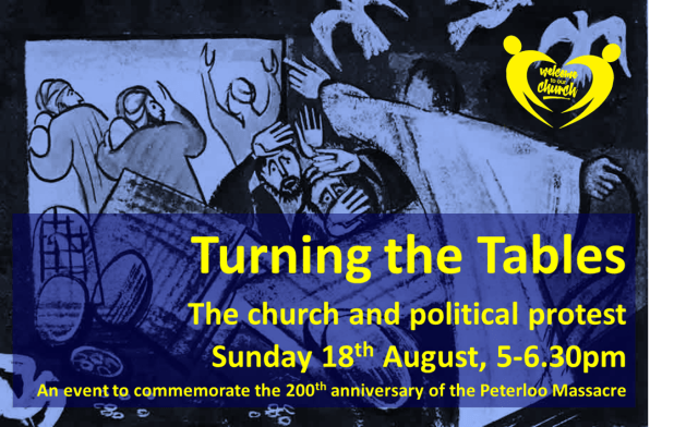 On 18th August our church held a “pop-up” event to commemorate the 200th anniversary of the Peterloo massacre. It was inspired by an earlier celebration at Manchester Cathedral which had pointed out that committed Christians had been involved on both sides of the political divide at Peterloo. Many non-conformist Christians had been helped organsie the protest but there were prominent clergymen amongst the group of magistrates who ordered the troops to disperse the crowd. We thus had a session to explore whether and how individual Christians and the church as an institution should engage in political protest today. This started hearing from two Quakers who are involved in protests against the arms trade, a representative of Extinction Rebellion and a Methodist minister involved in opposing expressions of hate against minorities. After this we had a time of open discussion of the issues followed by an act of worship.